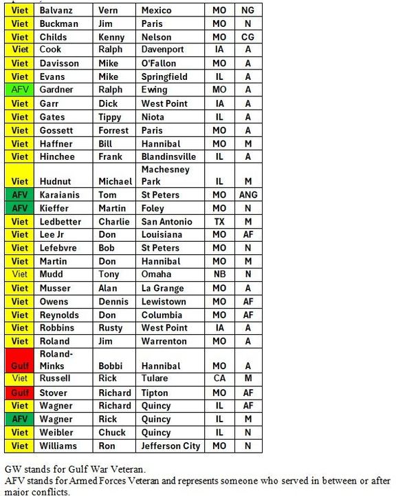 The veterans on this flight come from Missouri (Marion, Audrain, Boone, Cole, Lewis, Lincoln, Moniteau, Monroe, Pike, Ralls, Saline, St. Charles, Tulare, Tulare, and Warren counties), Illinois (Adams, McDonough, Hancock, Sangamon and Winnebago counties), and Iowa (Lee and Scott Counties). We will also have veterans who served with local veterans and are joining them from California, Texas and Nebraska. The veterans served in a number of roles among them Aviation Mechanic, Paratrooper, Radio Communications, Intelligence Officer, Baker, Postal Clerk and Nuclear Weapons Specialist to showcase the variety of key roles that are part of our Nation’s Armed Forces. A list of the veterans and their hometowns is included at the end of this News Release.