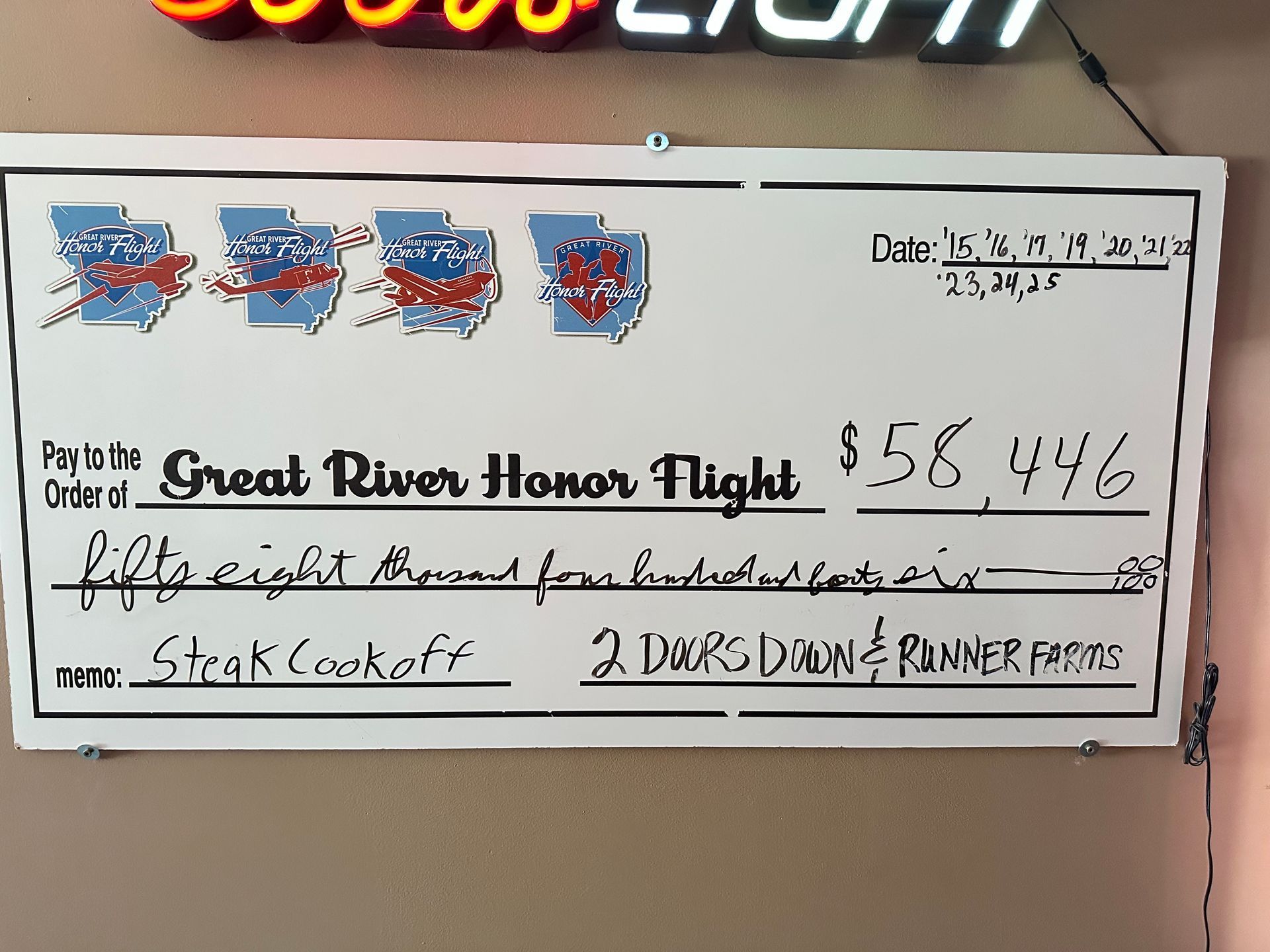 Jan Runner along with Two Doors Down Bar in Blandinsville presented a check to Great River Honor Flight board members Sharon Lake, Tom Geise and Carlos Fernandez for $9,026 from their annual Steak Cookoff. This event has raised $58,446 over the many years it has supported GRHF.