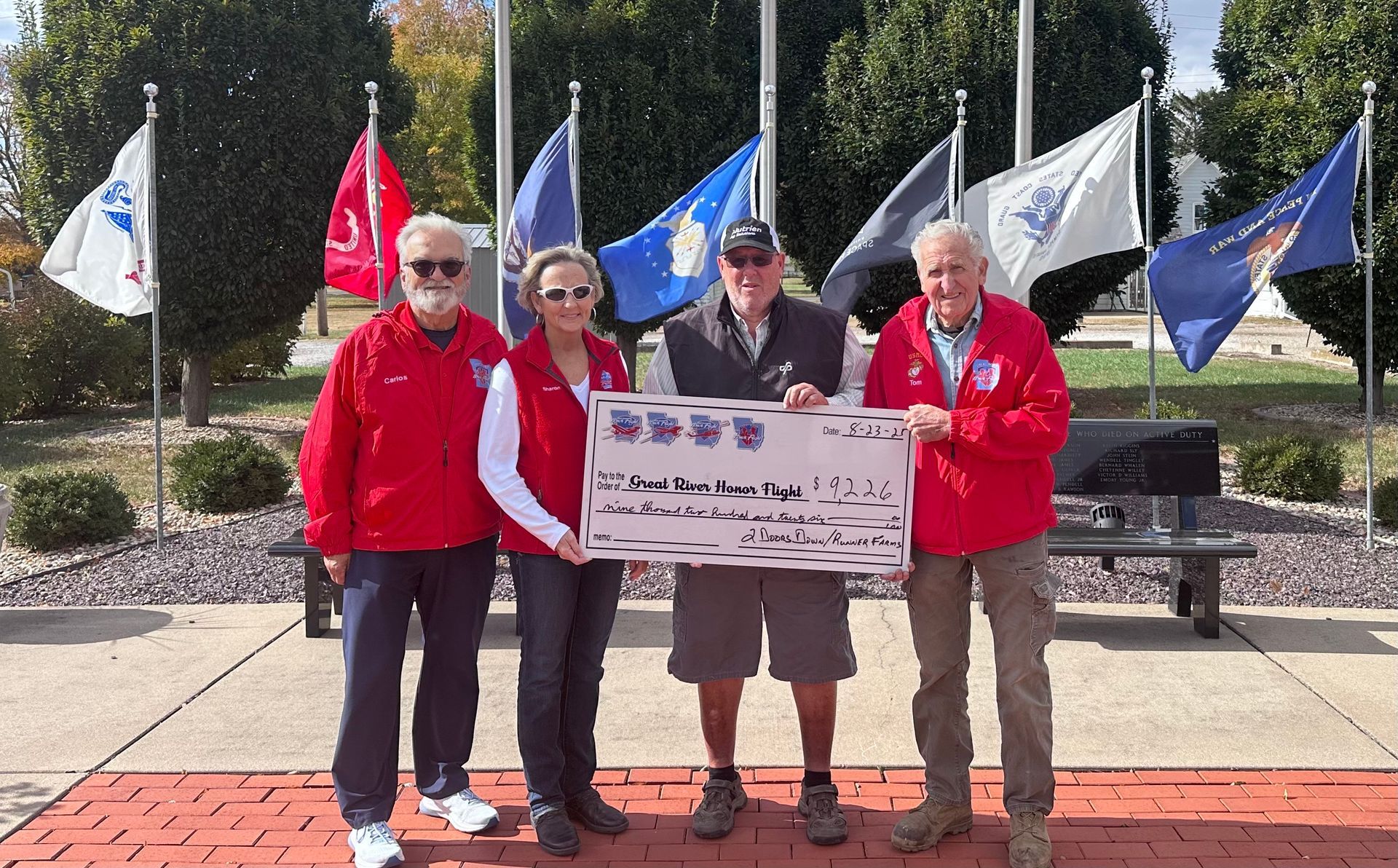 August 26, local businesses in Blandinsville, led by 2 Doors Down and Runner Farms held their annual cook off for Great River Honor Flight. This is the 8th year this event has been held to raise money for the program as well as for upkeep and improvements to the Veterans Memorial in that community. This year's donation came to $4,500 which puts the overall total at $35,427.