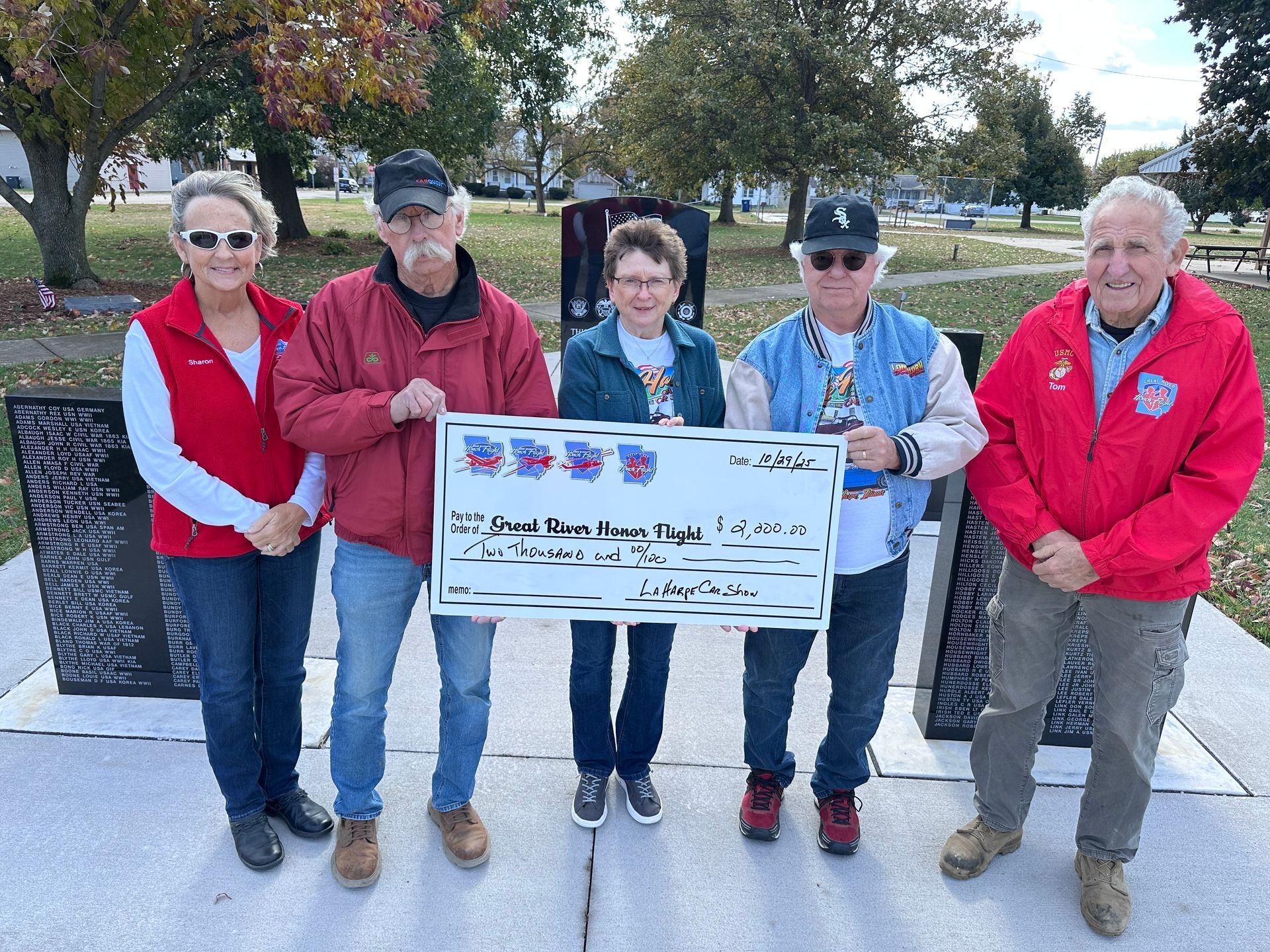 Jerry Buford, representing the Annual La Harpe Car Show donated $2,000 from this year's event to Great River Honor Flight. The car show has been a backer of Honor Flight for over 10 years.